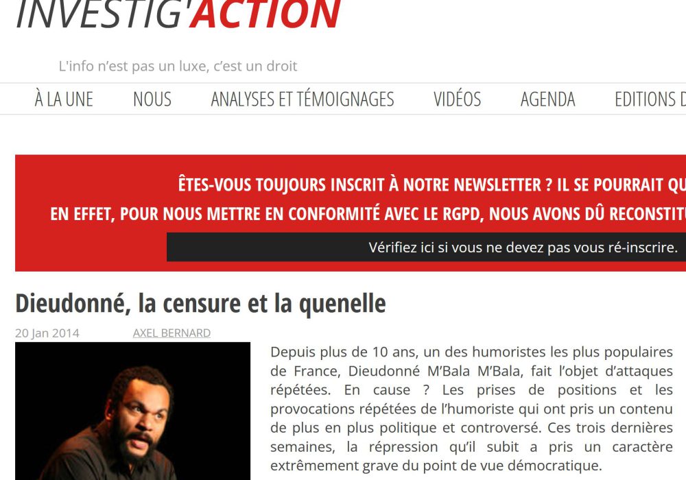En parcourant ce site, l’on s’aperçoit pourtant que la critique virulente des États-Unis s’accompagne d’un « antisionisme » tout autant insistant. On y parle de « lobby israélien », tout en récusant la confusion entre antisémitisme et antisionisme, mais on défend, au nom de la liberté d’expression, la « répression » qui s’acharne sur un certain Dieudonné, dont la « quenelle » ne serait qu’un geste visant à exprimer « un dégout extrêmement divers vis-à-vis d’un système ou d’une élite politique, médiatique et économique qui veut imposer sa pensée unique », toujours en reconnaissant que ce geste a de fait été repris à leur compte par certains racistes et antisémites. L’on n’est pas antisémite mais un des collaborateurs régulier d’Investig’ation régulier est Saïd Bouamama, proche du PIR, qui lui-même n’est pas très clair sur l’antisémitisme.