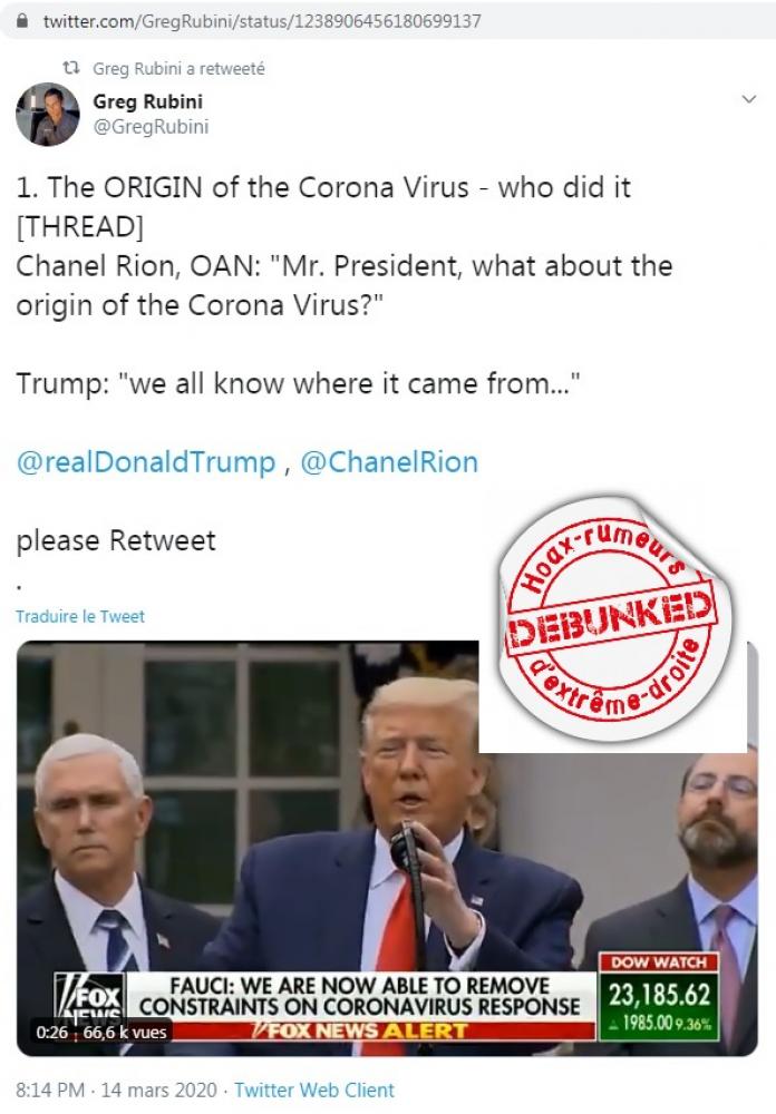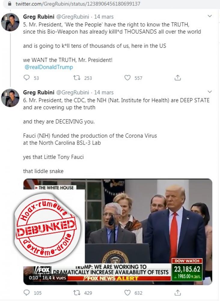 Rubini a déclaré que le nouveau coronavirus «a été GÉNÉTIQUEMENT CONÇU comme une arme biologique à l’Univ. de Caroline du Nord BSL-3 Lab. » Il a également déclaré qu’il avait été propagé de la Caroline du Nord à la Chine, à l’Italie et ailleurs aux États-Unis par «l’État profond» dans un complot «visant à détruire l’économie Trump». En outre, Rubini a suggéré que le Dr Anthony Fauci, le chef très respecté de l’Institut national des allergies et des maladies infectieuses, a personnellement financé la production du virus, l’appelant même «Little Tony Fauci».
