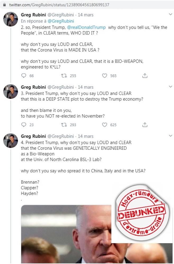 Or rien ne prouve que Rubini soit une «source autorisée» pour quiconque, sauf Rion. Il s’agit d’un citoyen ordinaire d’extrême droite qui promeut les théories du complot de «l’état profond» sur Twitter, où il compte plus de 100 000 followers. C’est -bien entendu- un soutien des QAnon…