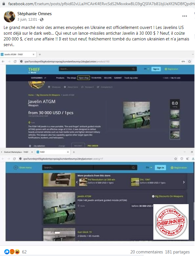 On retrouve également des armes fournies à l’Ukraine par les pays de l’OTAN sur le marché « Black Market Guns ». Des missiles antichars NLAW sont proposés pour 15 000 dollars, et le drone américain Switchblade 600 Kamikaze est disponible pour 7000 dollars.