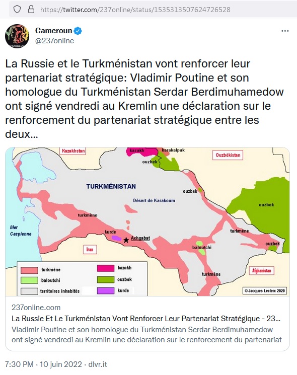 En effet, les posts qui insistent sur l’importance des bons rapports Russie/Turkménistan. Or rien n’est moins vrai. Les relations de ces pays sont pour le moins compliquées en raison de l’importante production de gaz turkmène. Et pas qu’avec ce pays mais aussi avec toutes les républiques centrasiatiques. Les restes de la dictature soviétique n’ont pas été oubliées. Et d’ailleurs AUCUN de ces pays n’a pris partie pour la Russie (sans la désapprouver bien sûr). Pire: