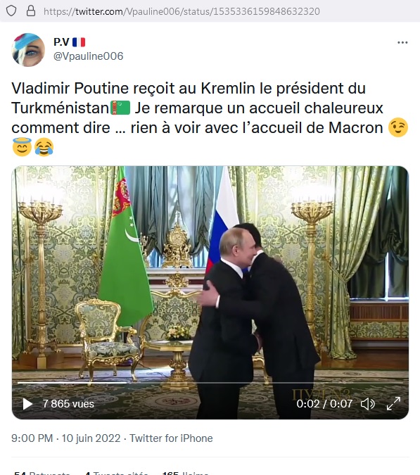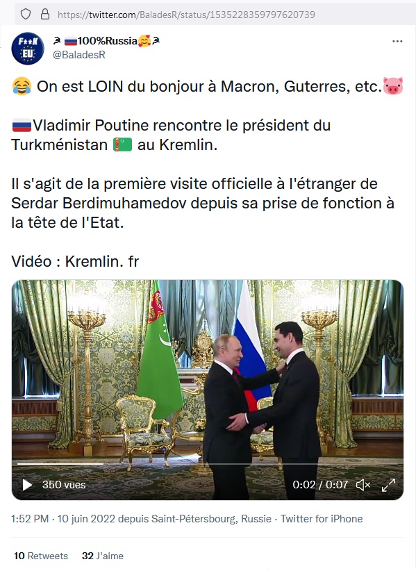 Comme nous le disions plus haut, la propagande poutinienne a plusieurs « sujets » à faire passer et la totalité des infoxs peut se classer sous 4 ou 5 items différents. Celle-ci relève de « l’isolement » de la Russie. La propagande a à cœur de montrer que non la totalité du monde ne suit pas l’occident dans cette affaire, ce qui est vrai. Mais pour parvenir elle emploie souvent des moyens caricaturaux. Exemple avec ce qui n’est ni tout à fait une véritable intox, une rumeur; il s’agit « juste » de vielles ficelles de propagande qui vont passer allègrement sur des « détails » absolument fondamentaux. Le nouveau président du Turkménistan, Serdar Berdymoukhammedov, s’est rendu au Kremlin le 10 juin dernier pour rencontrer son homologue russe, Vladimir Poutine. Et alors? Nous direz vous? Et bien la rencontre a été l’occasion pour les trolls russes d’une assez incroyable propagande, celle-ci insistant sur un point négligeable de leur rencontre: leur proximité physique. Puis sur « l’importance stratégique » de la rencontre.