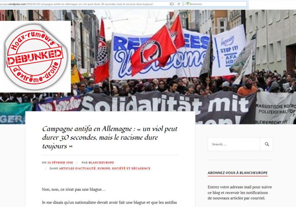 On s’étonnera tout de même que le hoaxeur n’ait pas pensé à réaliser le texte en allemand (puisque -soit-disant- c’est une campagne des antifas allemands).