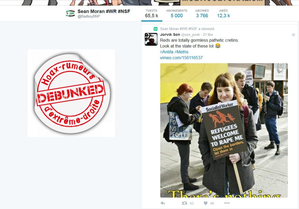 Enfin, les seuls éléments de cette campagne qui tourneraient autour des hashtag #refugeeswelcome et #antifa sont ceux des fachos eux-mêmes. Aucun bien sûr n’ayant pris le luxe de vérifier par eux-mêmes la réalité ou non de cette bouse.