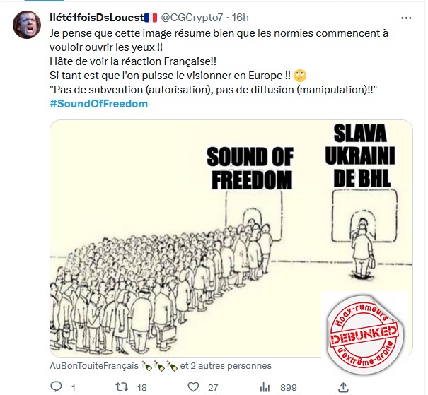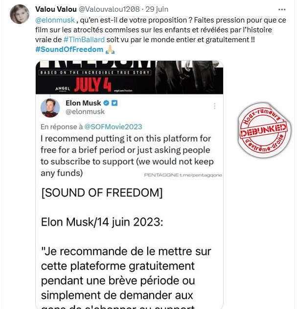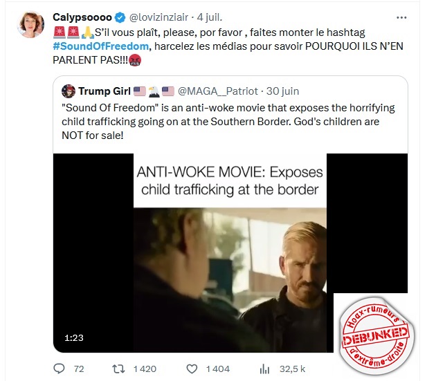 On y voit donc désormais fleurir les « tendances » d’extrême droite/complotistes du jour au lendemain. Pour nous c’est un bon indicateur des modes qui frappent quotidiennement les fachosphères. Nous n’avons donc pas été étonné de voir s’épanouir en tendance le film « Sound Of Freedom ». C’était jeudi 6 juin 2023, un jour ordinaire dans les fachosphères: