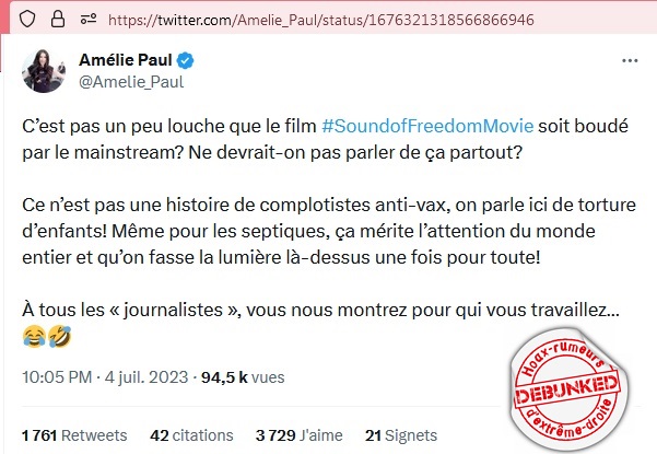On comprend de suite la frénésie qui s’empare de la fachosphère: pensez donc un film qui parle de leur obsession numéro 1: le trafic d’enfants. Il n’en fallait pas plus pour que les QAnon, les obsédés de l’adrénochrome ou les petits groupes malsains comme nos petits potes de « Wanted Pedo » s’en emparent comme étant LA preuve de leurs assertions.