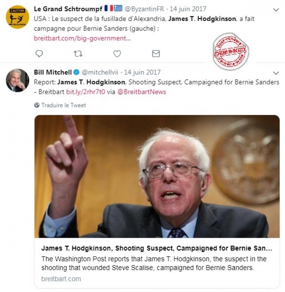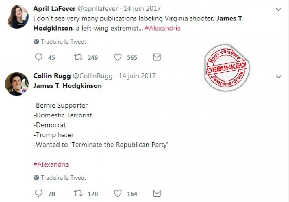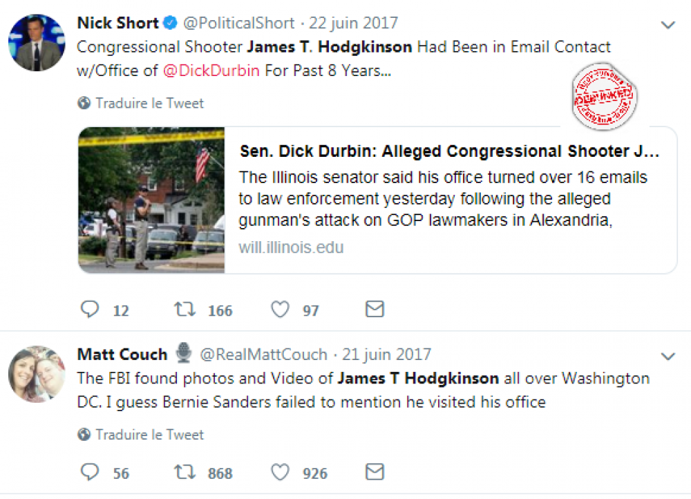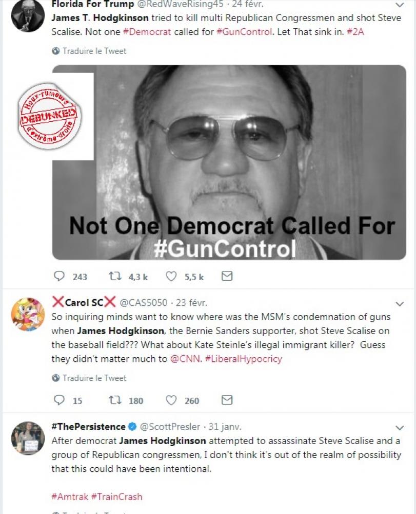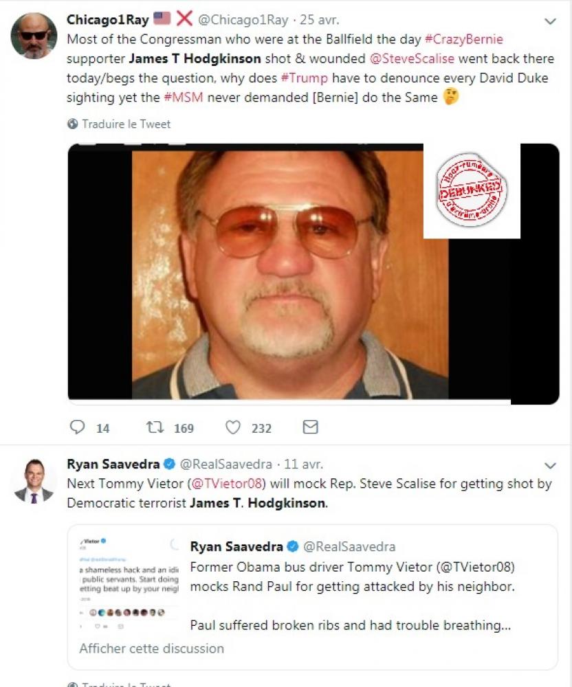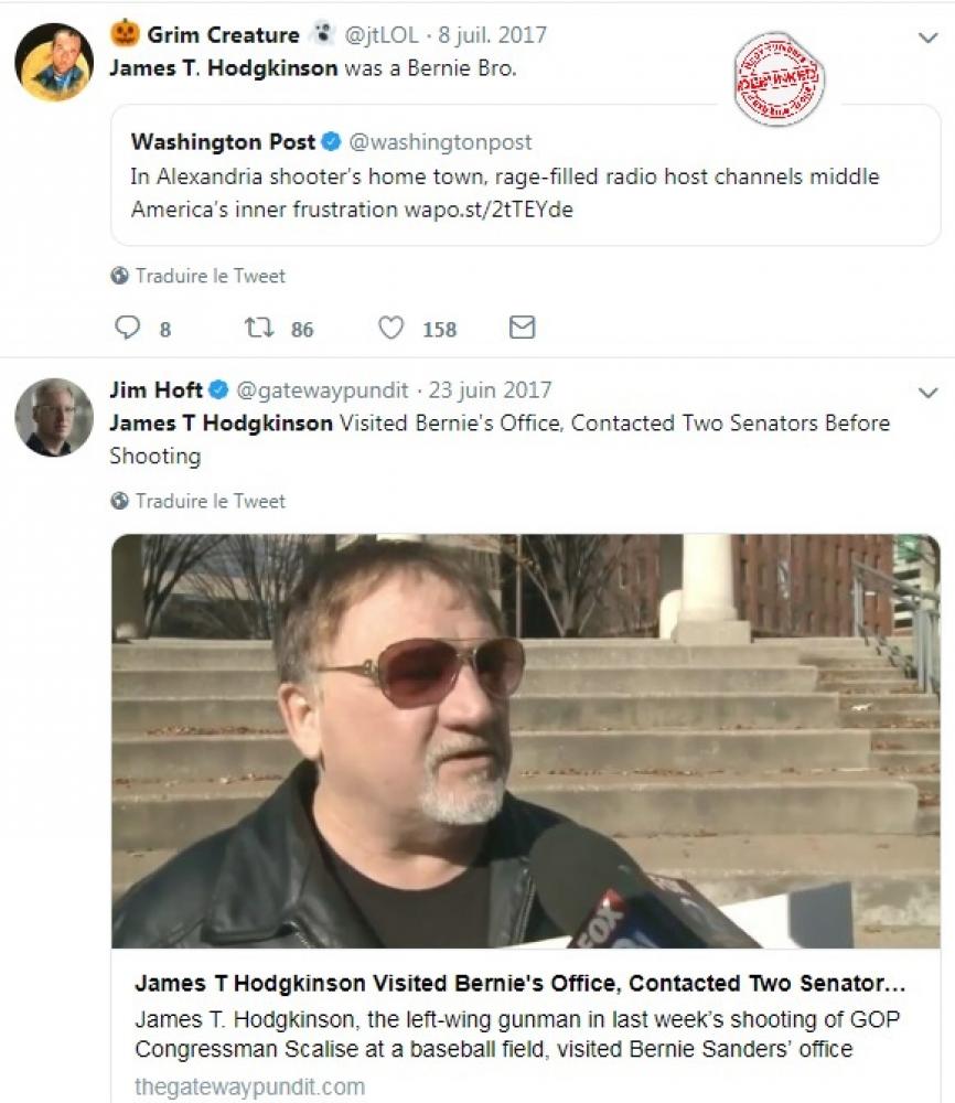 L’argumentation de Trump (et de Fdesouche) ne semblent guère probantes au vu de ce que nous avons trouvé. En effet, les réseaux sociaux grouillent de réactions complotistes et de récupérations politiques au moment du récent attentat de Washington commis par « James T. Hodgkinson ». Il n’y a même que l’embarras du choix…