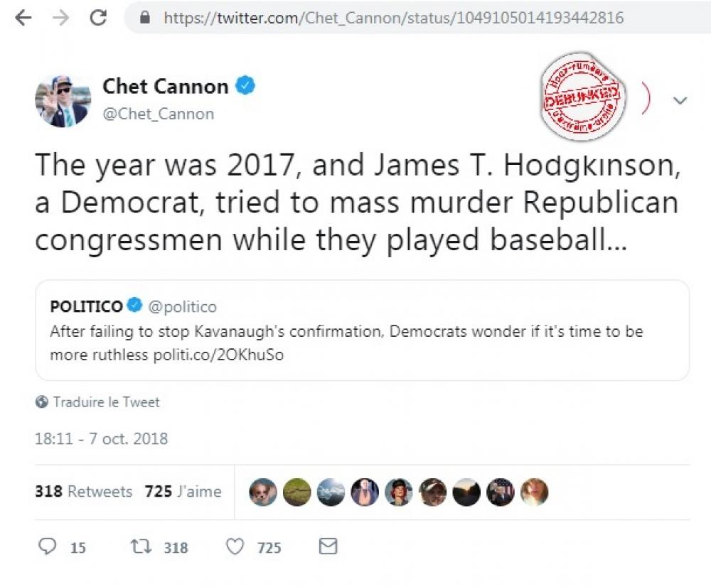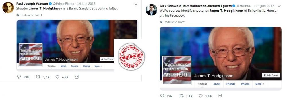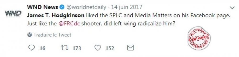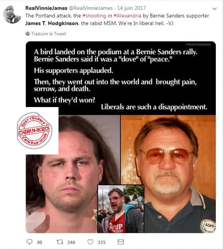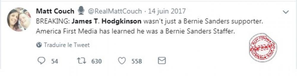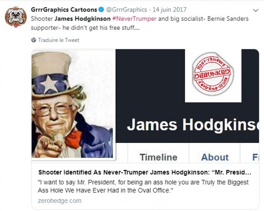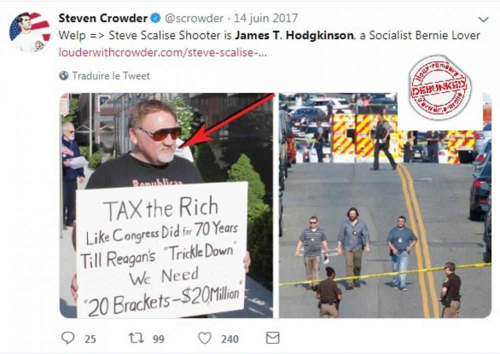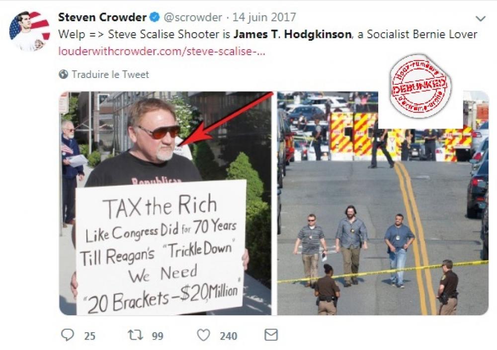 L’argumentation de Trump (et de Fdesouche) ne semblent guère probantes au vu de ce que nous avons trouvé. En effet, les réseaux sociaux grouillent de réactions complotistes et de récupérations politiques au moment du récent attentat de Washington commis par « James T. Hodgkinson ». Il n’y a même que l’embarras du choix…