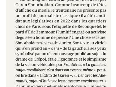 Et pire encore, loin de nettoyer leur passé, ils tentent de le réhabiliter. Et c’est très exactement ce que fait Frontières/Shnorhokian dans cette tentative. En même temps, c’est dans les gènes de Reconquête et de Zemmour qui tente depuis des années cette opération.