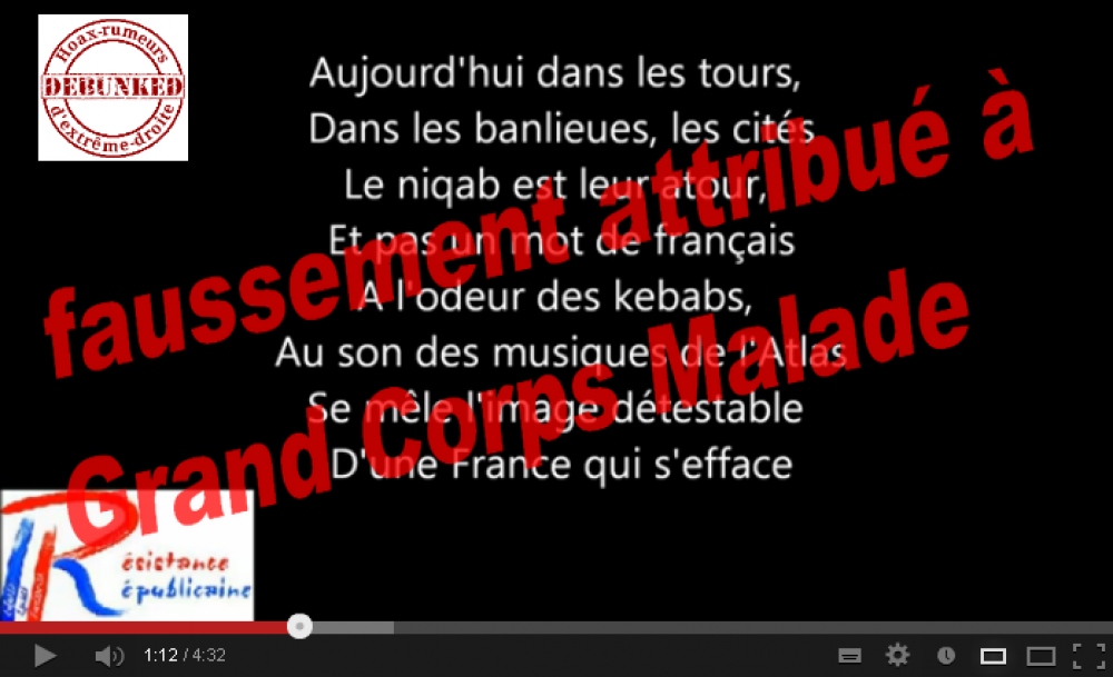 - Mais il est très probable aussi que d’autres fanas de la Le Pen et de l’Identité Blanche diffusent ce faux en connaissance de cause. Sur la page Youtube de « Peuple de France », un message avertissait qu’il ne s’agissait pas d’un clip de Grand Corps Malade : curieusement , l’avertisssement a disparu.