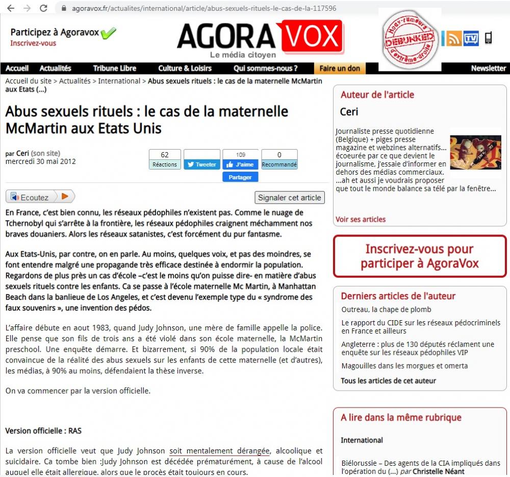 Avez vous déjà entendu parler de l’affaire de la maternelle Mc Martin ? Il s’agir d’une affaire d’allégations de réseaux satanistes pédophiles violant des enfant dans une garderie. Un scandale énorme, et plus de dix ans d’enquête qui ont coûté 15 millions de dollars, avec des centaines d’enfants interrogés… Et tout ca pour quoi ? Un non-lieu. Car l’enquête a conclu à des allégations fallacieuses et de fausses accusations. Une théorie du complot grandeur nature… A laquelle certains croient encore aujourd’hui :