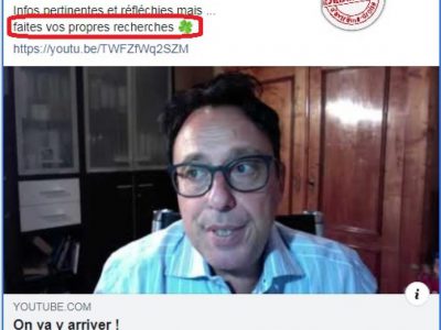 Bien sûr, QAnon ne serait pas ce qu’il est si il ne comprenait pas d’autres conspirations. Nous avons choisit celui-ci pour son ton exagérément eschatologique, dramatique et relayé en France par une des nombreuses dupes de QAnon (qui y ajoute une croyance sur les « vibrations », chères aux théories du complot sur les reptiliens):