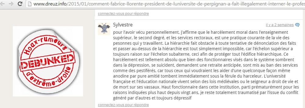 L’Université de Perpignan dénonce des accusations malveillantesLa rocambolesque démultiplication d’informations autour de la problématique psychiatrique du professeur Jean-Louis Caccomo, en poste à l’Université de Perpignan, comporte désormais des poursuites judiciaires. Les publications malveillantes sont visées et le Conseil d’Administration de l’établissement signe à son unanimité une motion de défense de l’image de l’université, et de son président, Fabrice Lorente.Les déboires psychiatriques du professeur Jean-Louis Cacccomo, de l’Université de Perpignan Via Domitia (UPVD), ont agité certains milieux de la communication numérique depuis le début de l’année. Le 12 janvier, nous évoquions la situation de cet économiste médicalement suivi, qui expose sa problématique personnelle sur les réseaux sociaux, à la vue de tous. La copie des contenus diffusés étant aisée, une montée en mayonnaise est observée depuis plusieurs jours. Le site américain francophone Dreuz.info, autodéfini comme « chrétien, pro-israélien et néo-conservateur », s’est engagé dans cette étrange opération.Motion unanime de l’UniversitéCe vendredi 30 janvier, pour stopper les distorsions d’information, le Conseil d’Administration de l’UPDV, réuni en séance plénière, a adopté une motion. Un communiqué précise que ses membres « s’indignent unanimement des accusations mensongères qui circulent sur certains sites internet et réseaux sociaux, relatives à l’internement prétendument abusif d’un collègue ». Les sages du campus réfutent des « propos jetant l’opprobre sur le fonctionnement institutionnel et l’approche humaine de l’établissement ». Ils « apportent leur plein et entier soutien au Président et à son équipe et leur confirment leur confiance ».Des poursuites judiciaires sont engagéesJeudi 29 janvier, le président de l’UPVD, Fabrice Lorente, nous transmettait le communiqué suivant : « Suite aux différentes publications récentes, sur Internet et dans les réseaux sociaux, contre l’Université de Perpignan et son président, nous avons saisi nos avocats qui rédigent les plaintes et recours judiciaires adaptés ». Ce samedi 31 janvier, le quotidien l’Indépendant, à Perpignan, évoque ses propres « investigations », selon lesquelles l’Université « n’a pas grand-chose à se reprocher », d’autant que « de nouveaux signalements de débordements arrivent en janvier 2015 aux oreilles de la direction ».