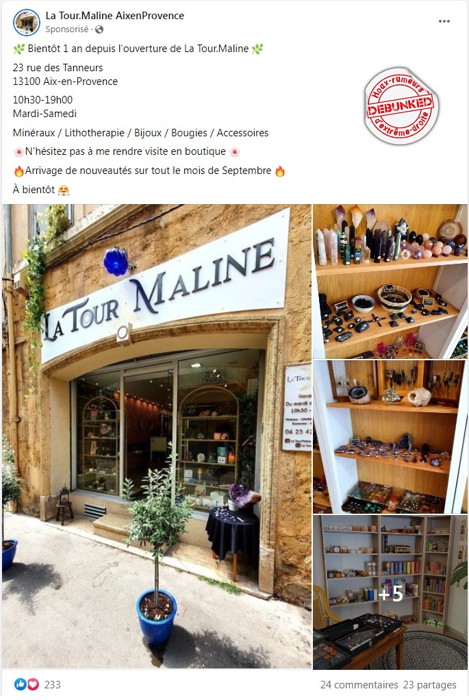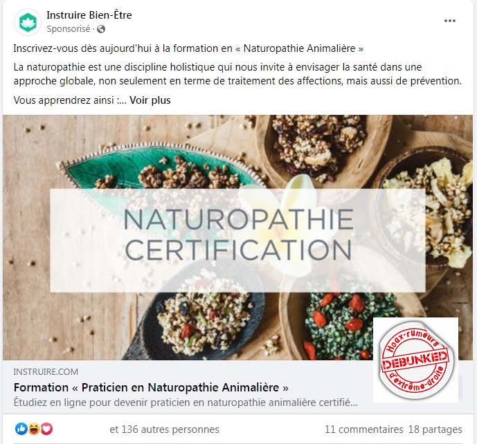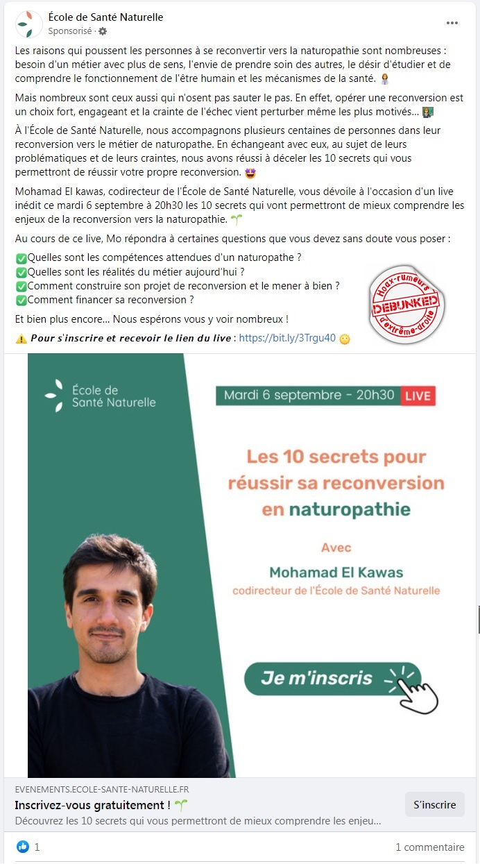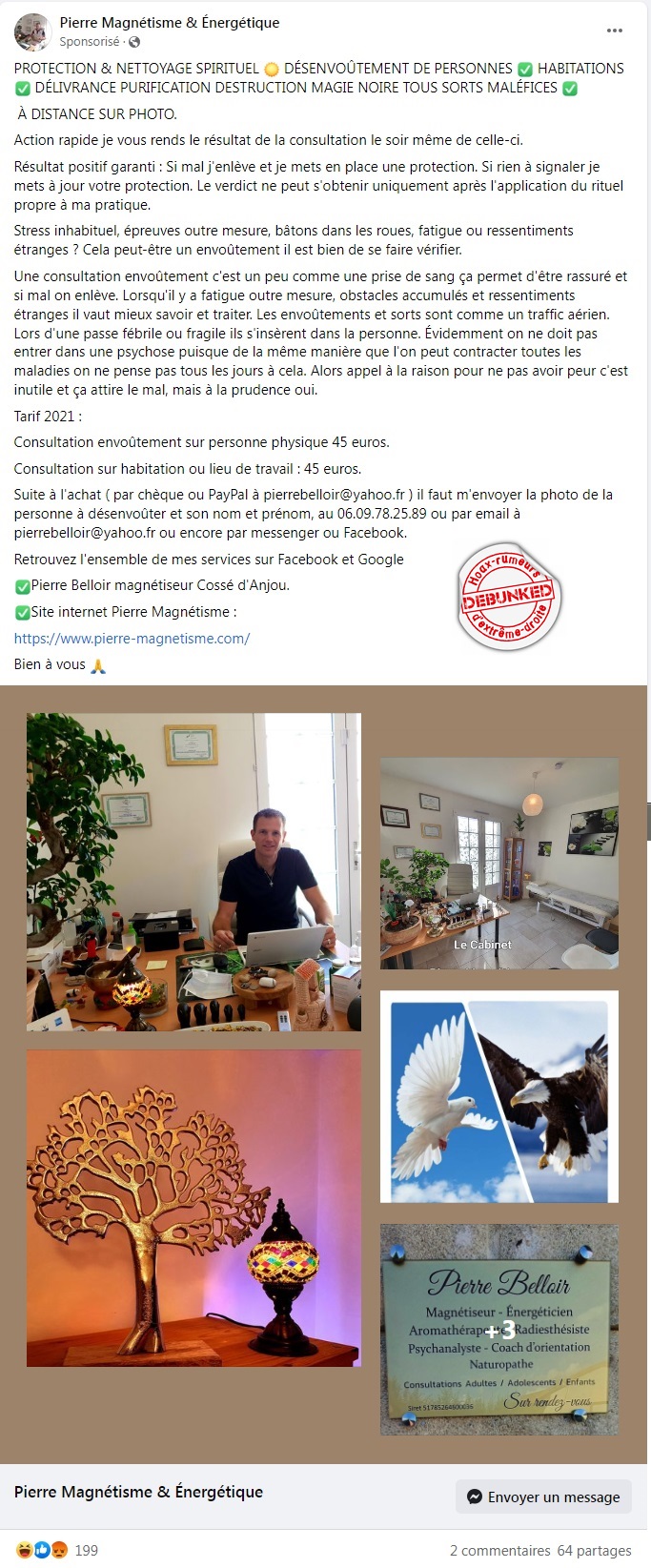 Mais que voulez vous faire quand le gouvernement lui-même donne de la visibilité à ses pseudos thérapies? Parmi ses dérives sectaires, l’anthroposophie a le vent en poupe. Mais il reste aussi les « petits producteurs » de la désinformation scientifique qui prospèrent sur le malheur et l’ignorance. Et ceux ci sont particulièrement choyées par facebook.