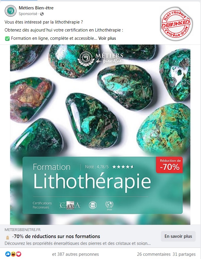 Mais grâce à la magie des algorithmes facebookiens, l’auteur a commencé à se voir proposer une pub pour une boutique de « lithothérapie ». Une pseudo sciences qui n’a absolument aucun fondement et qui attribue aux cristaux des pouvoirs de guérison magiques/vibratoires/quantiques (barrez les mentions inutiles).