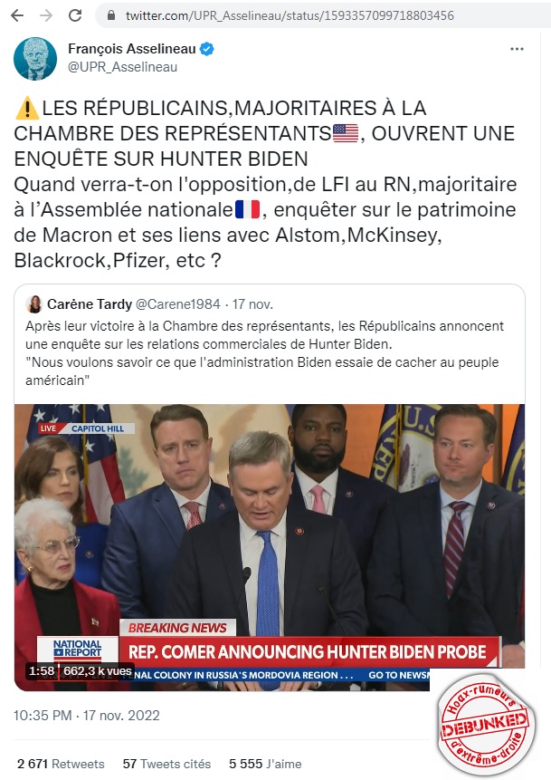 Au delà des faits qui montrent que « les » affaires Hunter Biden sont construites sur du vent et servent surtout à rapporter des subsides quotidiens à ceux qui s’y adonnent. Au delà des faits objectifs qui montrent les mensonges en série des Azalbert/Aberkane/Asselineau/Philippot sur ce sujet ; il ne faut pas le prendre avec le sourire. Les événements américains du 6 janvier montrent que des parties de la population se convertissent de plus en plus à des assertions qui pourtant peuvent sembler délirantes. Et ce faisant menacent les fragiles équilibres des démocraties.