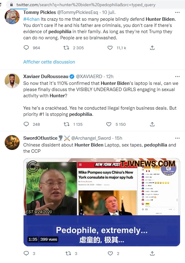 Il faut dire que l’affaire vient d’en haut. Toujours pendant la campagne américaine de 2019, Giuliani et Bannon ont lancé les rumeurs du fameux disque dur appartenant soit disant à Hunter Biden. Et c’est Giuliani à nouveau qui a lancé la rumeur par la suite que ce disque dur contenait soit disant des images pédophiles de Hunter Biden. Des sites comme « Natural News », InfoWars ont ensuite repris la rumeur en l’amplifiant de façon démesurée. Et enfin ces fake news sont arrivées sur 4chan, le repaire américain des QAnon.