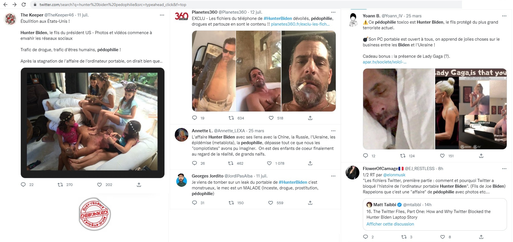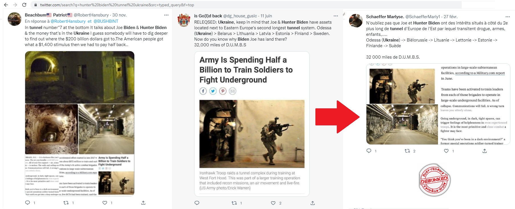 A partir de là la rumeur s’entretient elle même. D’autres rumeurs apparaissent aux USA, complémentant les premières, se confondant avec elles, au fur et à mesure de l’évolution de l’activité. Ainsi qu début de la guerre russo-ukrainienne apparaissent les théories de complots sur des tunnels (l’autre obsession des QAnon) sous l’Ukraine abritant les activités de la « cabale » de Hunter Biden. L’adrénochrome n’est pas bien loin. Puis par la magie de la traduction, ces fake news arrivent en France, relayées par un public crédule: