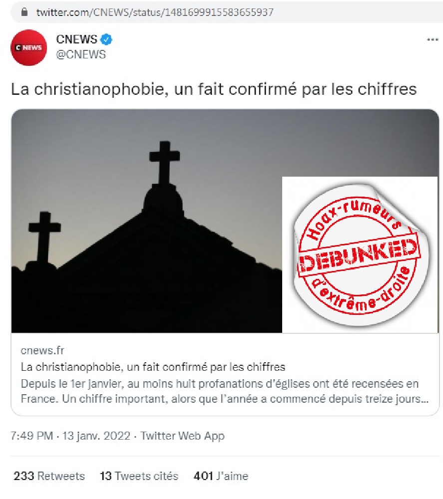 Nouvel article de CNEWS, nouvelle fièvre/panique morale de l’extrême droite et Xième manipulation donc. Il faut le redire, il n’y a pas en France une explosion des actes antichrétiens, et nous ne sommes pas à Beyrouth. Et comme pour les articles précédents de ce style, nous publierons des mises à jour des affaires judiciaires décrites. Debunked !!!