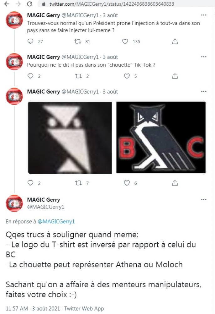 Effectivement, le logo du tee shirt de Macron semble bien une chouette stylisée, mais au final, bien malin qui pourrait le dire réellement vu que l’Elysée ne s’exprime pas à ce sujet (et à la limite on le comprend). Problème: quasi nulle part la chouette n’est elle associée au culte de Moloch (enfin le soit disant culte). Les seuls endroits où elle l’est c’est dans les articles fantaisistes des conspis fascisants qui reprennent leurs délires sur le « Bohemian Grove ».