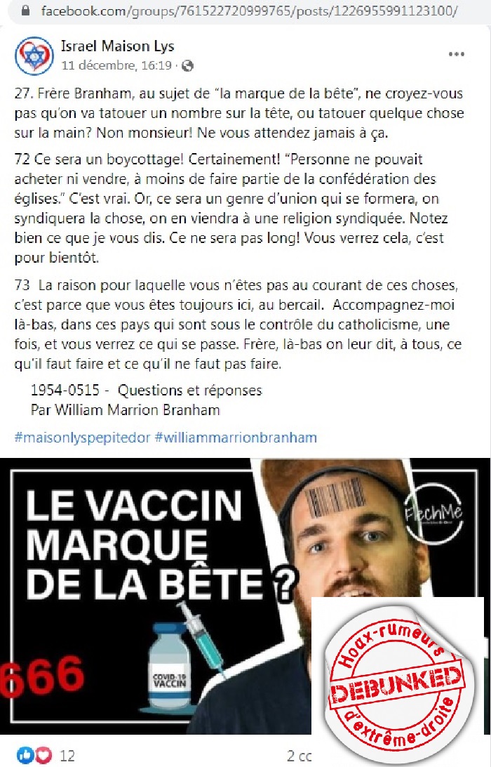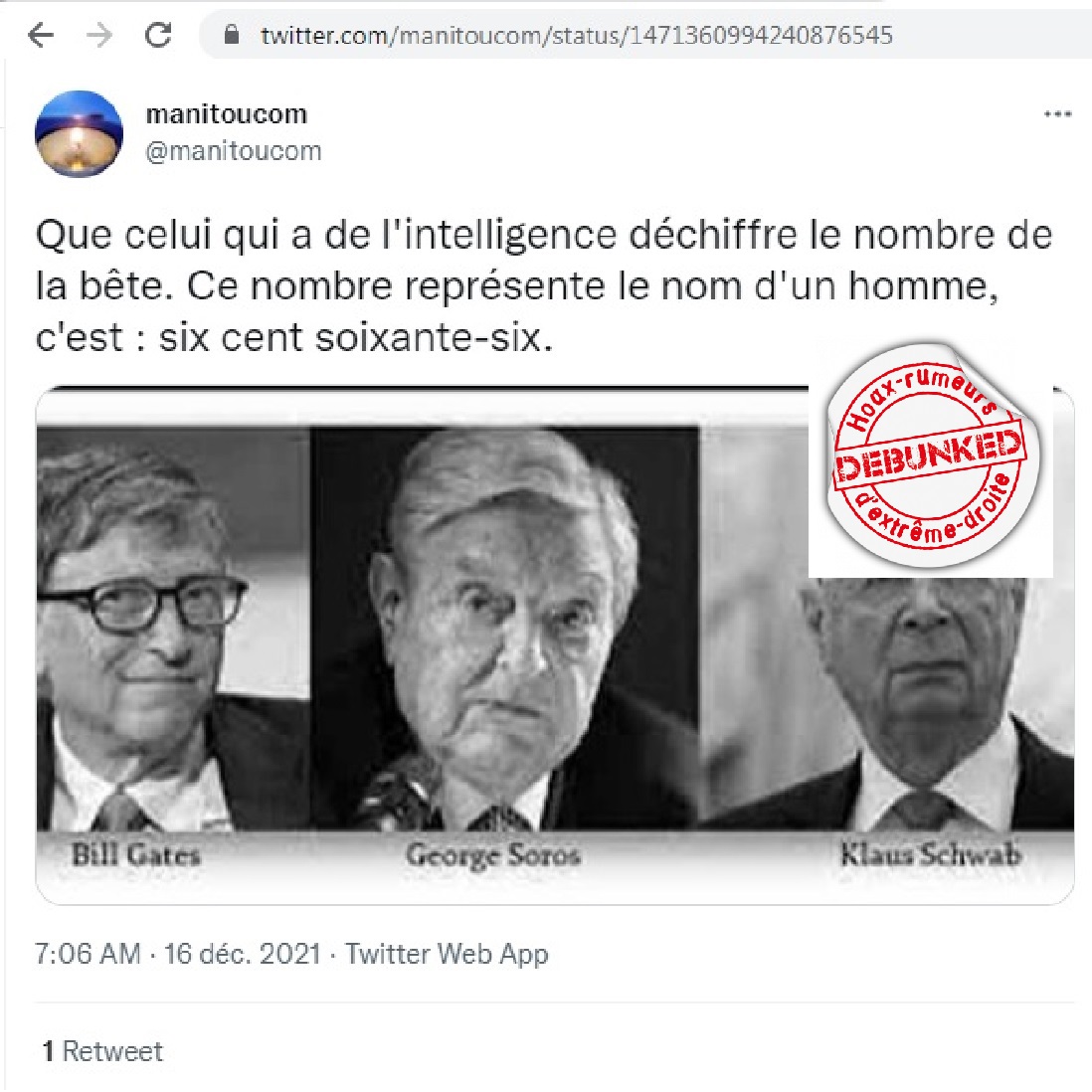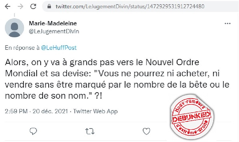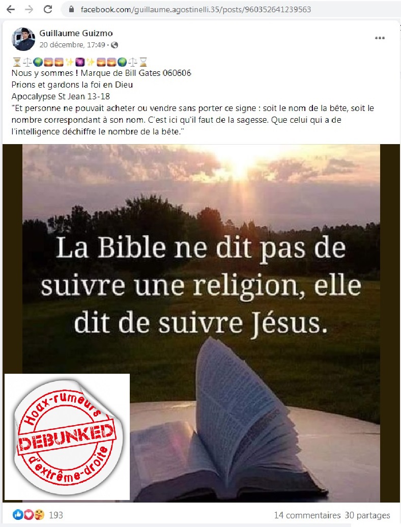 Enfin ce type de fake news permet au complotiste qui la publie de se sentir parmi « les élus ». La prophétie elle-même n’indique t’elle pas que c’est « celui qui a de l’intelligence » « calcule le nombre de la bête »? Un bel exemple d’auto narcissisation…
