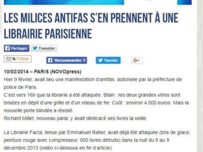 Le FN/RN accuse alors Valls, alors ministre de l’intérieur, de complicité avec les antifas. Les identitaires font de même. Mais aussi l’extrême droite ultra catho, des médias de « réinformation » comme « Breizh infos », l’UPR et des troisièmes couteaux de l’extrême droite.