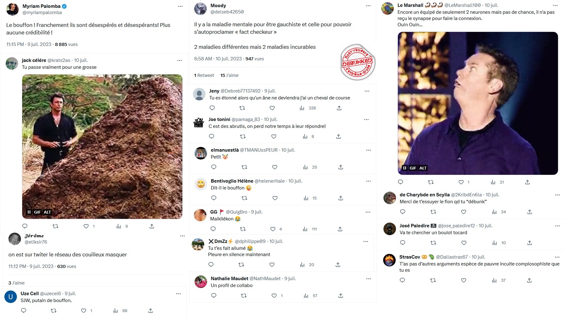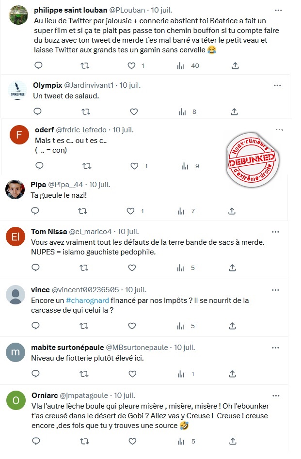 Même si en soi, elles n’ont pas d’importance réelle dans cette histoire; puisque nous les avons juste choisit pour notre petite étude (et qu’en fait elles jouent un rôle de centre de gravité pour les complotistes) on peut se poser la question de QUI sont « Béatrice Rosen » et « Myriam Palomba »? La première est une actrice de 4ème catégorie. Elle est apparue dans divers films comme actrice de figuration. Sa vraie reconnaissance est venue suite à la crise COVID. Remarquée depuis 2021 pour ses positions antivax, elle intègre l’émission de Cyril Hanouna « Touche pas à Mon poste » en février 2022. C’est une habituée des raids de cyber harcèlement, elle a déjà été incriminée pour une affaire semblable contre Franck Clarot, alias@Le_Doc. Son positionnement politique est facilement visible sur ses « likes » twitter: