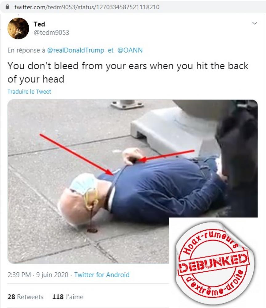 L’un prétend qu’on « ne saigne pas de l’oreille après avoir chuté de cette façon » donc que c’est faux, l’autre que c’est un dispositif avec du « faux sang »… CQFD