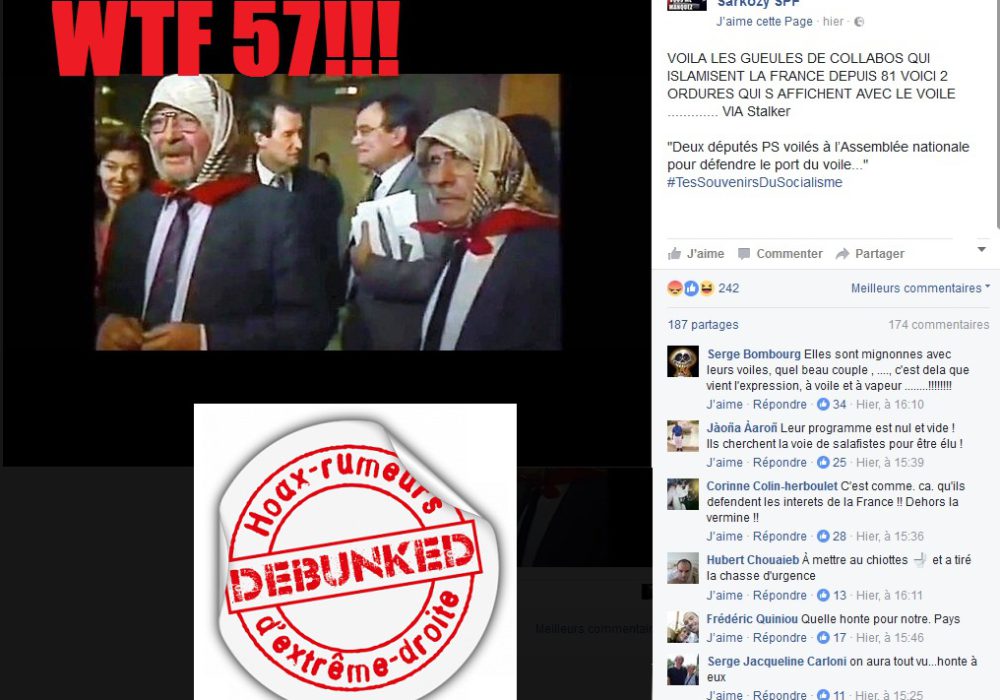 Deux députés socialistes qui se présentent voilés à l’Assemblée nationale, cela ne peux que vouloir dire qu’ils sont « collabos, nazislamistes », etc… vous connaissez maintenant… Le post s’accompagnant des insultes et menaces de rigueur « chez ces gens là »…